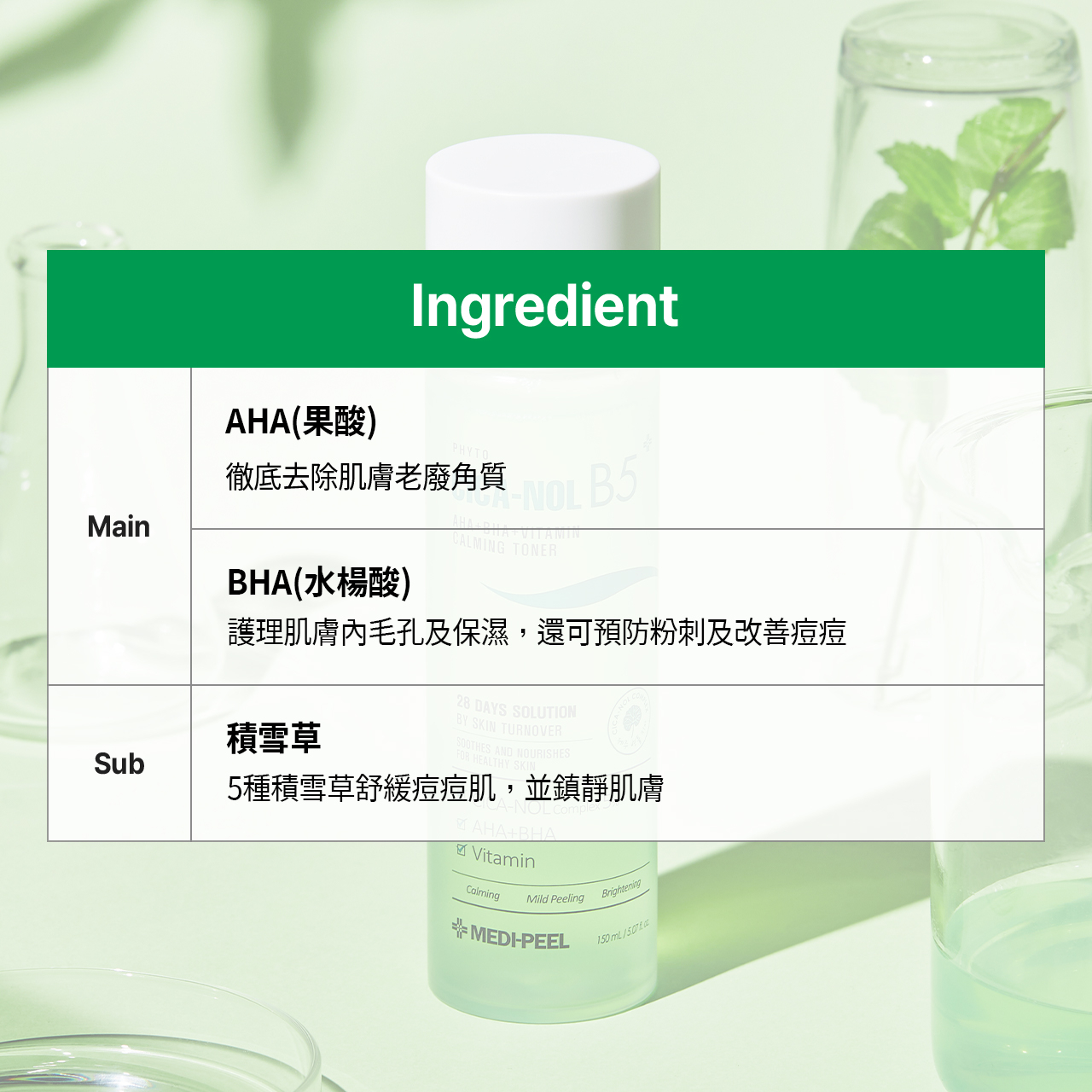 積雪草苷 (500 ppb)、積雪草酸 (500 ppb)、羥基積雪草酸 (500 ppb)、泛醇 (100 ppm)、乳酸桿菌/大豆發酵提取物、白柳(柳樹)樹皮提取物、肉桂皮提取物、牛至葉提取物、扁柏葉提取物、黃芩根提取物、馬齒莧提取物、檸檬酸(10 ppm)、乳酸(9 ppm)、丁二醇、透明質酸鈉、膠原蛋白提取物、甜菜鹼、尿囊素、腺苷、水楊酸 (1,000 ppb)、EDTA 二鈉、丙烯酸甘油酯/丙烯酸共聚物、乙基己基甘油、1,2-己二醇、羥基苯乙酮、辛二醇、甘草酸二鉀、聚甘油-10 肉荳蔻酸酯、新戊二醇二癸酸酯、十六烷基乙基己酯陽極,Ceteth-20 , Stareth-20, 硬脂酸甘油酯, 鯨蠟硬脂醇, 生育酚乙酸酯, 卡波姆, 氨丁三醇, CI 42090, CI 19140, 香料